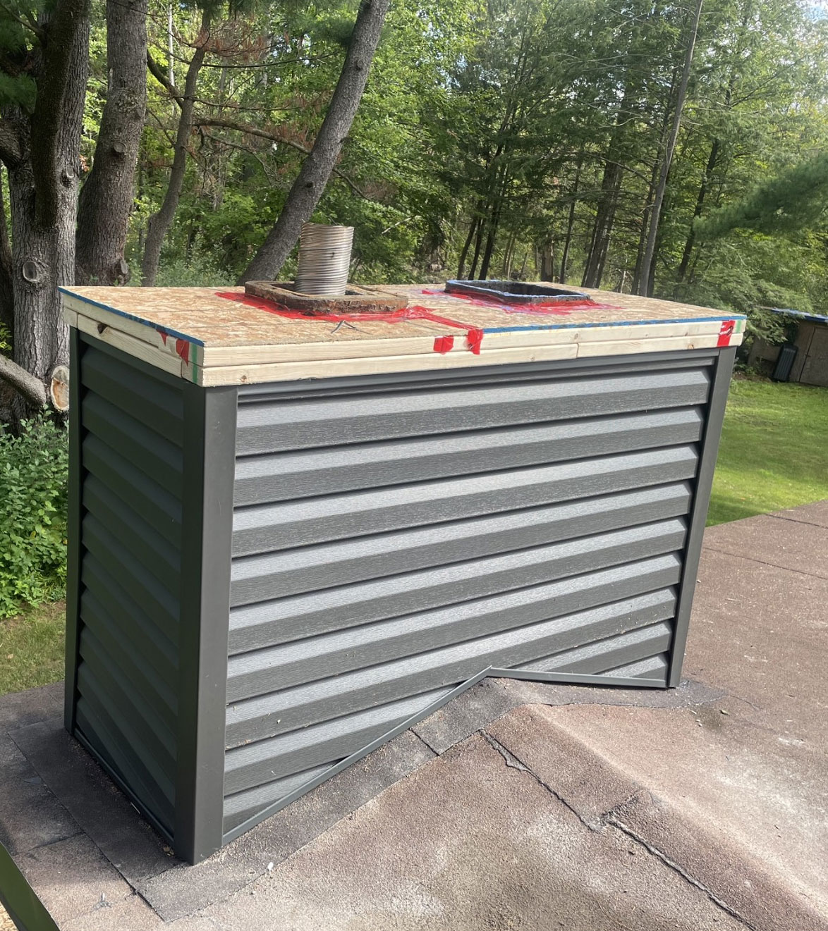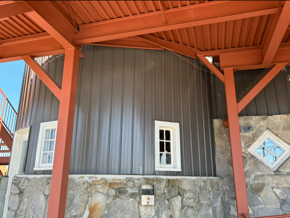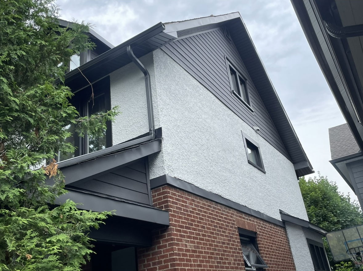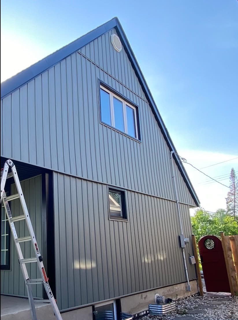 Steel sheet metal siding installed on a residential home. Description: Durable, fire-resistant steel siding designed to withstand extreme weather conditions in Ottawa.
