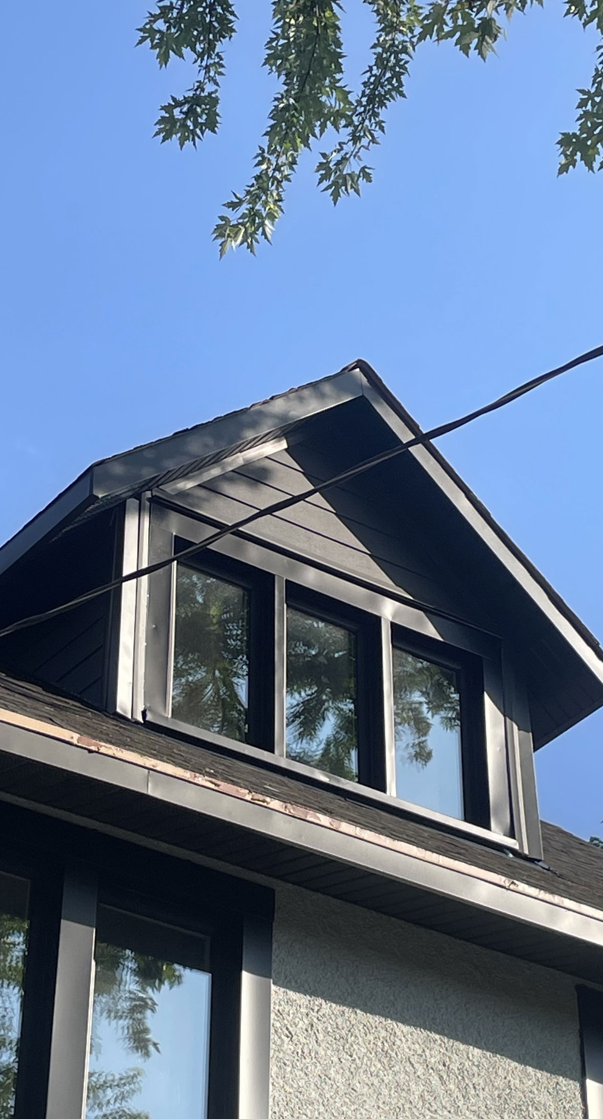 Composite Siding Dormer. Custom composite siding with matching metal fascia. Description: Designed to complement modern and traditional architectural styles, this composite siding enhances durability and curb appeal.