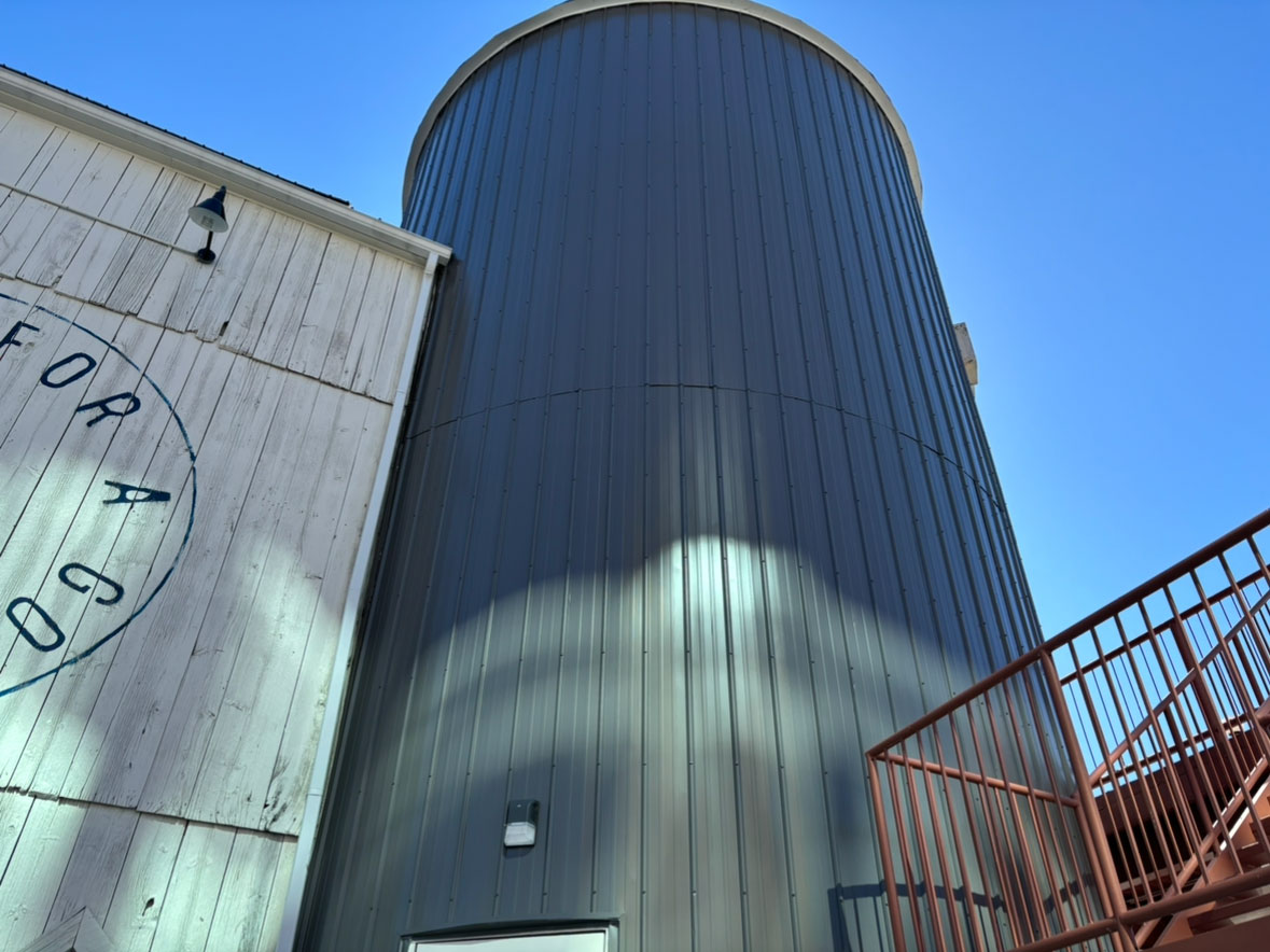 Sheet Metal Siding Steel. : Silo steel sheet metal siding installed on a rural home and barn. Description: Heavy-duty silo steel siding, perfect for residential homes, barns, and garages, ensuring long-term durability.